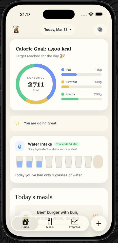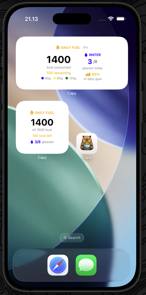 No barcode scanner. No food database. No calorie math. Just describe your meal naturally - Capy does everything else in seconds.